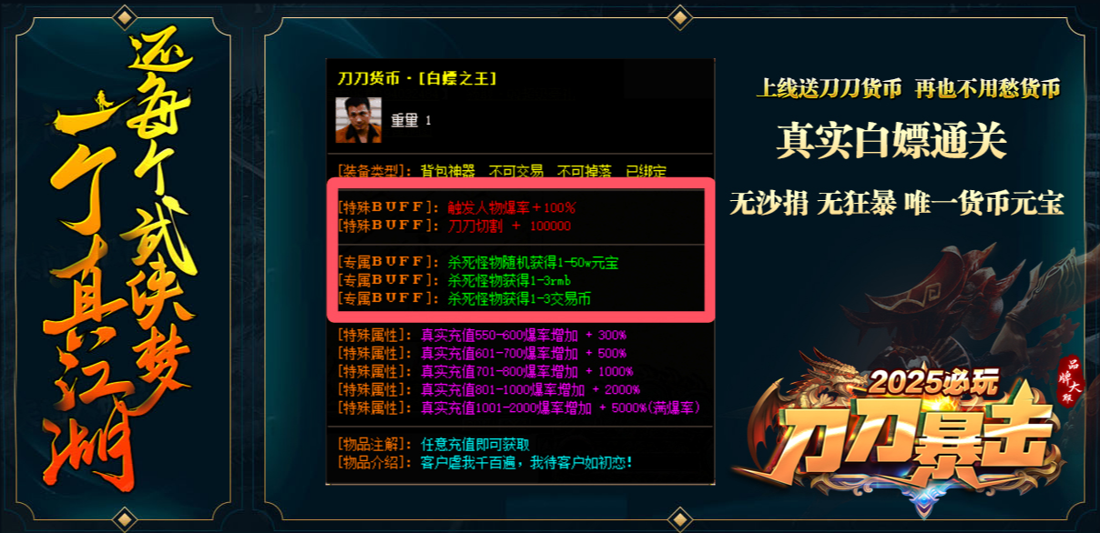 - 【版本说明】: 上线就送MAX刀速+双倍爆率提升.装备嗷嗷全爆.人人土豪装逼又激情!